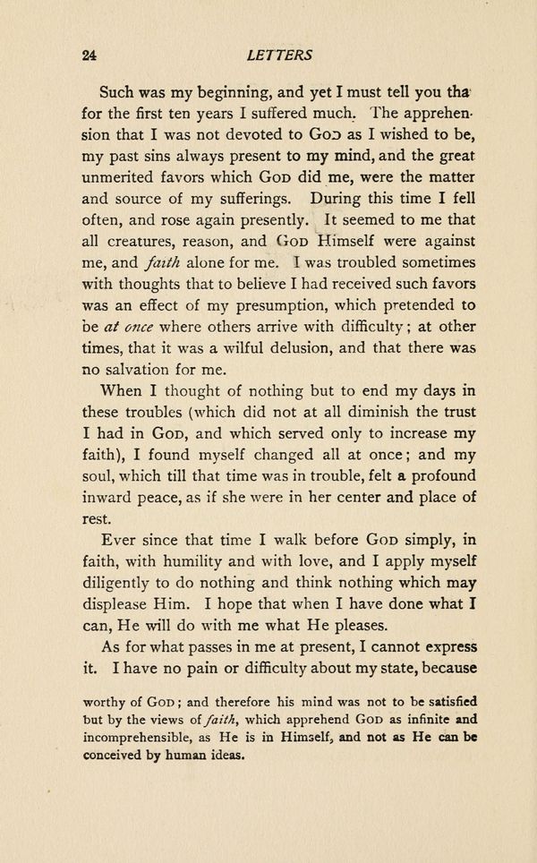 Such was my beginning, and yet I must tell you that for the first ten years I suffered much. The apprehension that I was not devoted to GOD as I wished to be, my past sins always present to my mind, and the great unmerited favors which GOD did me, were the matter and source of my sufferings. During this time I fell often, and rose again presently. It seemed to me that all creatures, reason, and GOD Himself were against me, and faith alone for me. I was troubled sometimes with thoughts that to believe I had received such favors was an effect of my presumption, which pretended to be at once where others arrive with difficulty; at other times, that it was a wilful delusion, and that there was no salvation for me.