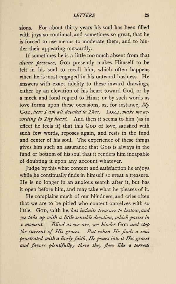 He complains much of our blindness, and cries often that we are to be pitied who content ourselves with so little. GOD, saith he, has infinite treasure to bestow, and we take up with a little sensible devotion, which passes in a moment. Blind as we are, we hinder GOD and stop the current of His graces. But when He finds a soul penetrated with a lively faith, He pours into it His graces and favors plentifully; there they flow like a torrent.