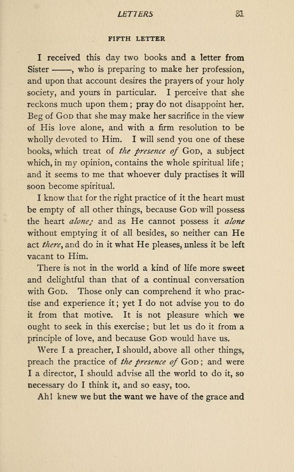 I received this day two books and a letter from Sister ______, who is preparing to make her profession, and upon that account desires the prayers of your holy society, and yours in particular. I perceive that she reckons much upon them; pray do not disappoint her. Beg of GOD that she may make her sacrifice in the view of His love alone, and with a firm resolution to be wholly devoted to Him. I will send you one of these books, which treat of the presence of GOD, a subject which, in my opinion, contains the whole spiritual life; and it seems to me that whoever duly practises it will soon become spiritual.