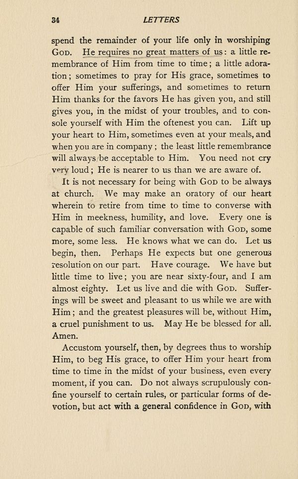 It is not necessary for being with GOD to be always at church. We may make an oratory of our heart wherein to retire from time to time to converse with Him in meekness, humility, and love. Every one is capable of such familiar conversation with GOD, some more, some less. He knows what we can do. Let us begin, then. Perhaps He expects but one generous resolution on our part. Have courage. We have but little time to live; you are near sixty-four, and I am almost eighty. Let us live and die with GOD. Sufferings will be sweet and pleasant to us while we are with Him; and the greatest pleasures will be, without Him, a cruel punishment to us. May He be blessed for all. Amen.