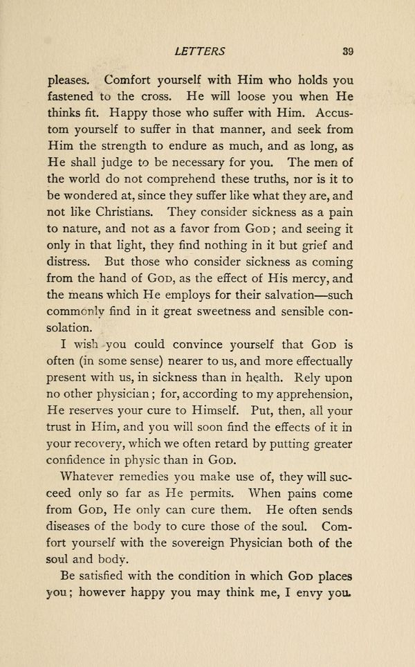 pleases. Comfort yourself with Him who holds you fastened to the cross. He will loose you when He thinks fit. Happy those who suffer with Him. Accustom yourself to suffer in that manner, and seek from Him the strength to endure as much, and as long, as He shall judge to be necessary for you. The men of the world do not comprehend these truths, nor is it to be wondered at, since they suffer like what they are, and not like Christians. They consider sickness as a pain to nature, and not as a favor from GOD; and seeing it only in that light, they find nothing in it but grief and distress. But those who consider sickness as coming from the hand of GOD, as the effect of His mercy, and the means which He employs for their salvation — such commonly find in it great sweetness and sensible consolation.