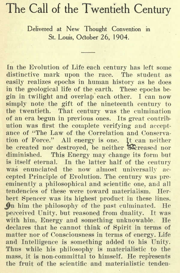 In the Evolution of Life each century has left some distinctive mark upon the race. The student as easily realizes epochs in human history as he does in the geological life of the earth. These epochs begin in twilight and overlap each other. I can now simply note the gift of the nineteenth century to the twentieth. That century was the culmination of an era begun in previous ones. Its great contribution was first the complete verifying and acceptance of "The Law of the Correlation and Conservation of Force." All energy is one. It can neither be created nor destroyed, be neither Teased nor diminished. This Energy may change its form but is itself eternal. In the latter half of the century was enunciated the now almost universally accepted Principle of Evolution. The century was preeminently a philosophical and scientific one, and all tendencies of these were toward materialism. Herbert Spencer was its highest product in these lines. On him the philosophy of the past culminated. He perceived Unity, but reasoned from duality. It was with him, Energy and something unknowable. He declares that he cannot think of Spirit in terms of matter nor of Consciousness in terms of energy. Life and Intelligence is something added to his Unity. Thus while his philosophy is materialistic to the mass, it is non-committal to himself. He represents the fruit of the scientific and materialistic tendencies