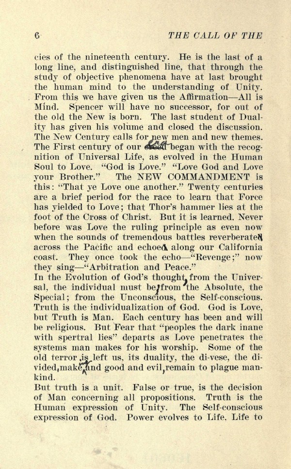 of the nineteenth century. He is the last of a long line, and distinguished line, that through the study of objective phenomena have at last brought the human mind to the understanding of Unity. From this we have given us the Affirmation—All is Mind. Spencer will have no successor, for out of the old the New is born. The last student of Duality has given his volume and closed the discussion. The New Century calls for new men and new themes. The First century of our 4 e egan with the recognition of Universal Life, as evolved in the Human Soul to Love. "God is Love." "Love God and Love your Brother." The NEW COMMANDMENT is this: "That ye Love one another." Twenty centuries are a brief period for the race to learn that Force has yielded to Love; that Thor's hammer lies at the foot of the Cross of Christ. But it is learned. Never before was Love the ruling principle as even now when the sounds of tremendous battles reverberate across the Pacific and echoed, along our California coast. They once took the echo—"Revenge;" now they sing—"Arbitration and Peace."