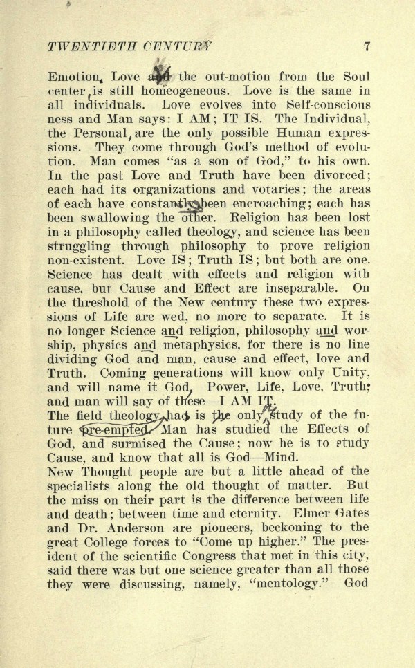 New Thought people are but a little ahead of the specialists along the old thought of matter. But the miss on their part is the difference between life and death; between time and eternity. Elmer Gates and Dr. Anderson are pioneers, beckoning to the great College forces to "Come up higher." The president of the scientific Congress that met in this city, said there was but one science greater than all those they were discussing, namely, "mentology." God