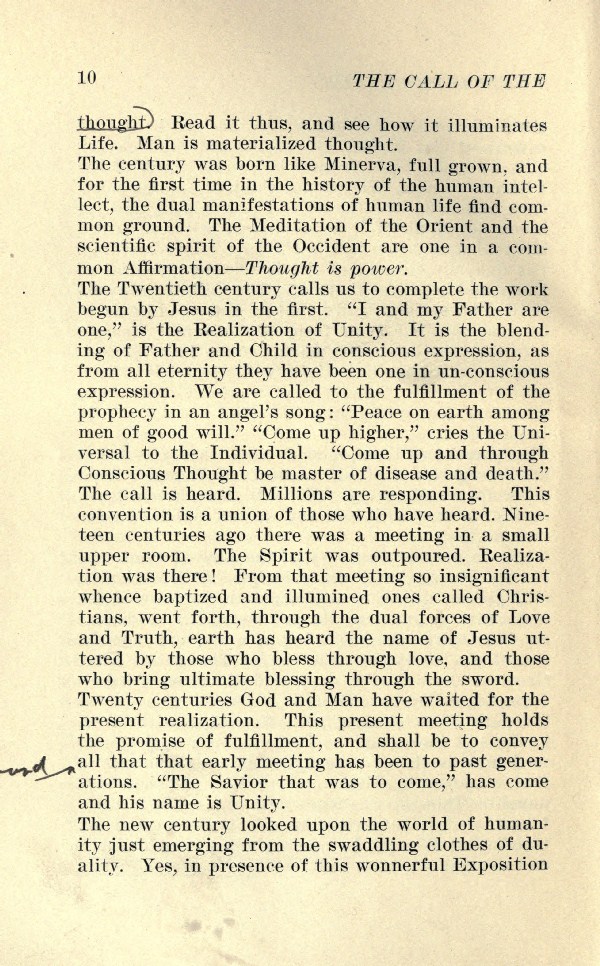 The Twentieth century calls us to complete the work begun by Jesus in the first. "I and my Father are one," is the Realization of Unity. It is the blending of Father and Child in conscious expression, as from all eternity they have been one in un-conscious expression. We are called to the fulfillment of the prophecy in an angel's song: "Peace on earth among men of good will." "Come up higher," cries the Universal to the Individual. "Come up and through Conscious Thought be master of disease and death." The call is heard. Millions are responding. This convention is a union of those who have heard. Nineteen centuries ago there was a meeting in a small upper room. The Spirit was outpoured. Realization was there! From that meeting so insignificant whence baptized and illumined ones called Christians, went forth, through the dual forces of Love and Truth, earth has heard the name of Jesus uttered by those who bless through love, and those who bring ultimate blessing through the sword. Twenty centuries God and Man have waited for the present realization. This present meeting holds the promise of fulfillment, and shall be to convey all that that early meeting has been to past generations. "The Savior that was to come," has come and his name is Unity.