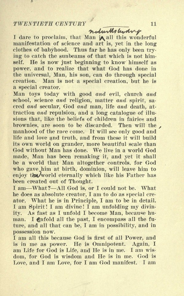 I dare to proclaim, that Man all this wonderful manifestation of science and art is, yet in the long clothes of babyhood. Thus far he has only been trying to catch the sunbeams of that which is not himself. He is now just beginning to know himself as power, and to realize that what God has done in the universal, Man, his son, can do through special creation. Man is not a special creation, but he is a special creator.