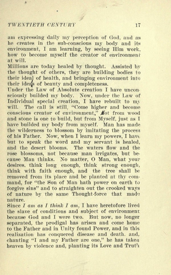 Under the Law of Absolute creation I have unconsciously builded my body. Now, under the Law of Individual special creation, I have rebuilt to my will. The call is still, "Come higher and become conscious creator of environment," lot from wood and stone is one to build, but from Myself, just as I have builded my body from myself. Man has made the wilderness to blossom by imitating the process of his Father. Now, when I learn my powers, I have but to speak the word and my servant is healed, and the desert blooms. The waters flow and the rose blossoms, not because man irrigates, but because Man thinks. No matter, 0 Man, what your desires, think long enough, think strong enough, think with faith enough, and the tree shall be removed from its place and be planted at thy command, for "the Son of Man hath power on earth to forgive sins" and to straighten out the crooked ways of nature by the same Thought-force that mad nature.