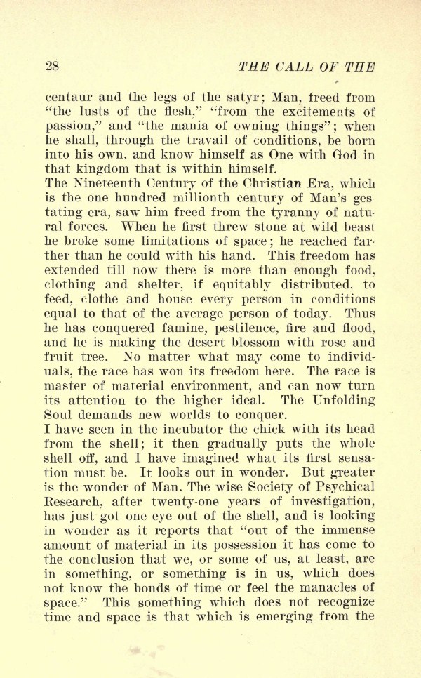 The Nineteenth Century of the Christian Era, which is the one hundred millionth century of Man's gestating era, saw him freed from the tyranny of natural forces. When he first threw stone at wild beast he broke some limitations of space he reached farther than he could with his hand. This freedom has extended till now there is more than enough food, clothing and shelter, if equitably distributed, to feed, clothe and house every person in conditions equal to that of the average person of today. Thus he has conquered famine, pestilence, fire and flood, and he is making the desert blossom with rose and fruit tree. No matter what may come to individuals, the race has won its freedom here. The race is master of material environment, and can now turn its attention to the higher ideal. The Unfolding Soul demands new worlds to conquer.