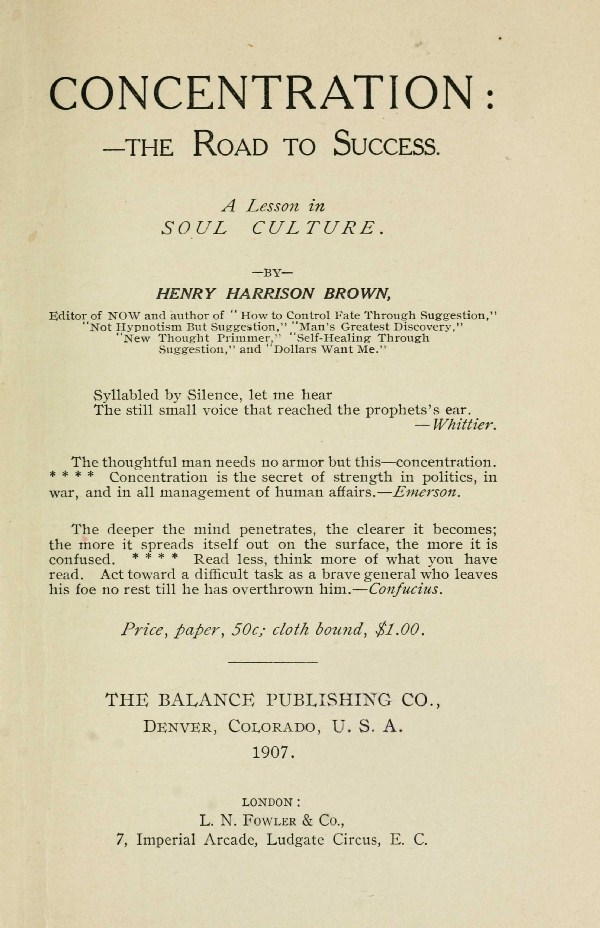 Introductory - What is Success? - The "Why" of the Book - Concentration a Natural Process - Paying Attention - Some Channels of Waste - "I Am Life" - How Shall I Concentrate - The Will - Habits - "In the Silence" - Compensation of Concentration - With Eyes See Not - The Ideal - Prayer - Desire versus Wish - Mental Poise - Methods of Concentration - Directions for Practice - How To Do It - Some Practical Suggestions - Self-Study and the Law of Life - Special Desires versus Principles - My One Rule:-Agreement - Love - Opinions and Methods of Others - A Parting Word -