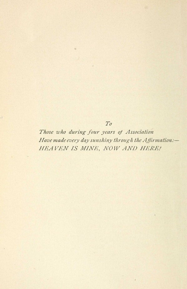 Introductory - What is Success? - The "Why" of the Book - Concentration a Natural Process - Paying Attention - Some Channels of Waste - "I Am Life" - How Shall I Concentrate - The Will - Habits - "In the Silence" - Compensation of Concentration - With Eyes See Not - The Ideal - Prayer - Desire versus Wish - Mental Poise - Methods of Concentration - Directions for Practice - How To Do It - Some Practical Suggestions - Self-Study and the Law of Life - Special Desires versus Principles - My One Rule:-Agreement - Love - Opinions and Methods of Others - A Parting Word -