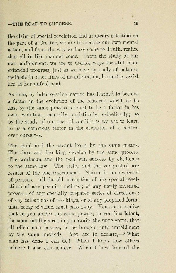 The child and the savant learn by the same means. The slave and the king develop by the same process. The workman and the poet win 'success by obedience to the same law. The victor and the vanquished are results of the one instrument. Nature is no respector of persons. All the old conception of any special revelation; of any peculiar method; of any newly invented process; of any specially prepared series of directions; of any collections of teachings, or of any prepared formulas, being of value, must pass away. You are to realize that in you abides the same power; in you lies latent, the same intelligence; in you awaits the same germ, that all other men possess, to be brought into unfoldment by the same methods. You are to declare, --- "What man has done I can do! When I know how others achieve I also can achieve. When I have learned the