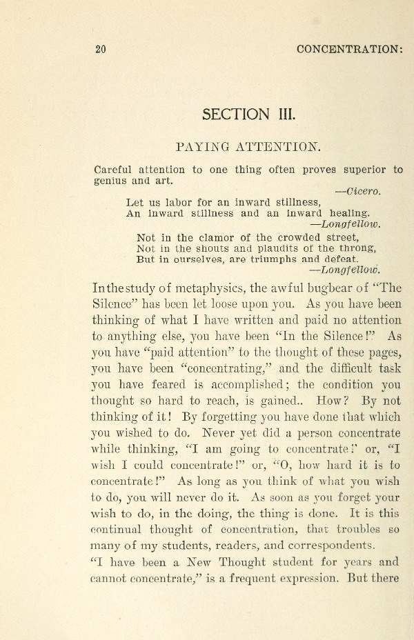 In the study of metaphysics, the awful bug-bear of "The Silence" has been let loose upon you. As you have been thinking of what I have written and paid no attention to anything else, you have been "In the Silence!" As you have "paid attention" to the thought of these pages, you have been "concentrating," and the difficult task you have feared is accomplished; the condition you thought so hard to reach, is gained.. How? By not thinking of it! By forgetting you have done that which you wished to do. Never yet did a person concentrate while thinking, "I am going to concentrate"' or, "I wish I could concentrate!" or, "0, how hard it is to concentrate!" As long as you think of what you wish to do, you will never do it. As soon as you forget your wish to do, in the doing, the thing is done. It is this continual thought of concentration, that troubles so many of my students, readers, and correspondents.