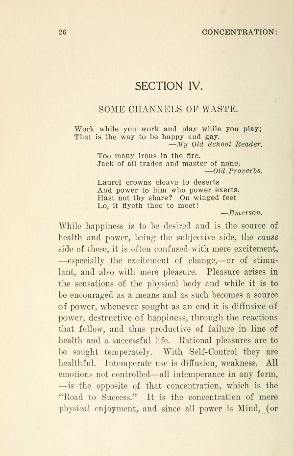 While happiness is to be desired and is the source of health and power, being the subjective side, the cause side of these, it is often confused with mere excitement, --- especially the excitement of change, --- or of stimulant, and also with mere pleasure. Pleasure arises in the sensations of the physical body and while it is to be encouraged as a means and as such becomes a source of power, whenever sought as an end it is diffusive of power, destructive of happiness, through the reactions that follow, and thus productive of failure in line of health and a successful life. Rational pleasures are to be sought temperately. With Self-Control they are healthful. Intemperate use is diffusion, weakness. All emotions not controlled-all intemperance in any form, --- is the opposite of that concentration, which is the "Road to Success." It is the concentration of mere physical enjoyment, and since all power is Mind, (or