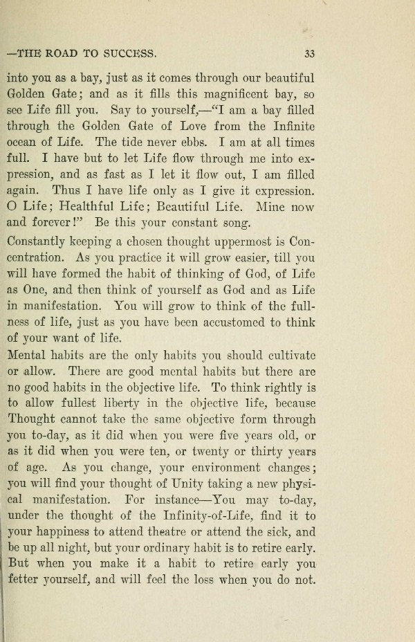 Constantly keeping a chosen thought uppermost is Concentration. As you practice it will grow easier, till you will have formed the habit of thinking of God, of Life as One, and then think of yourself as God and as Life in manifestation. You will grow to think of the fullness of life, just as you have been accustomed to think of your want of life.
