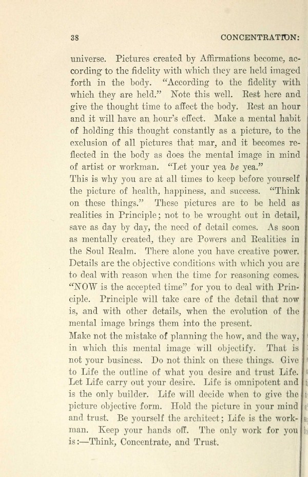 universe. Pictures created by Affirmations become, according to the fidelity with which they are held imaged forth in the body. "According to the fidelity with which they are held." Note this well. Rest here and give the thought time to affect the body. Rest an hour and it will have an hour's effect. Make a mental habit of holding this thought constantly as a picture, to the exclusion of all pictures that mar, and it becomes reflected in the body as does the mental image in mind of artist or workman. "Let your yea be yea."