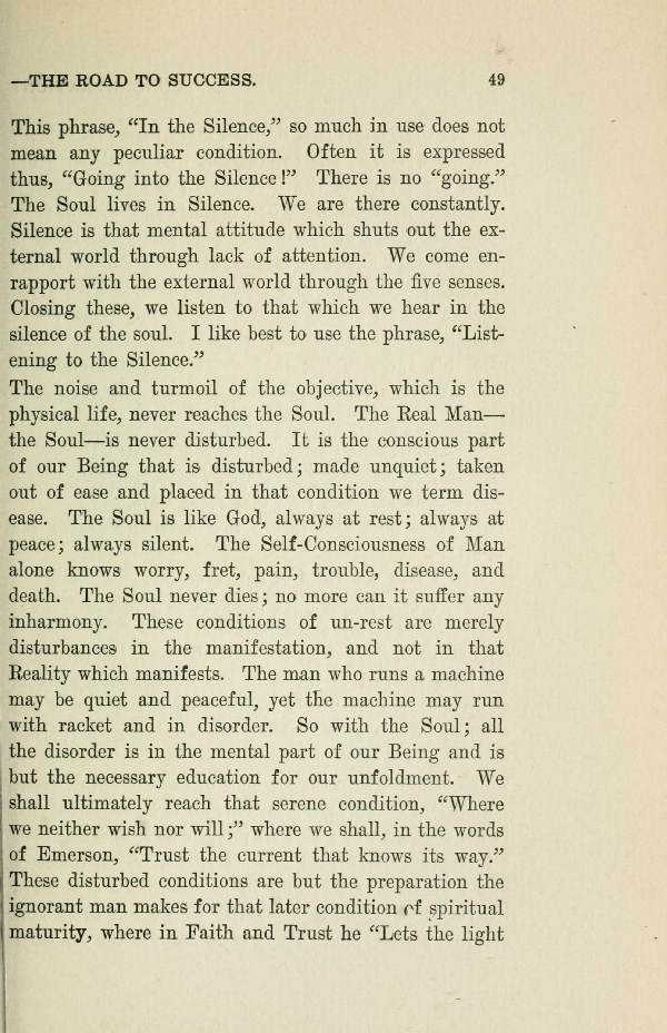 This phrase,"In the Silence," so much in use does not mean any peculiar condition. Often it is expressed thus, Going into the Silence! There is no going. The Soul lives in Silence. We are there constantly. Silence is that mental attitude which shuts out the external world through lack of attention. We come en-rapport with the external world through the five senses. Closing these, we listen to that which we hear in the silence of the soul. I like best to use the phrase, "Listening to the Silence."