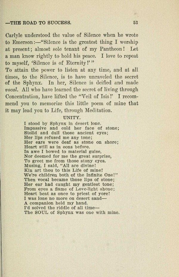 To attain the power to listen at any time, and at all times, to the Silence, is to have unraveled the secret of the Sphynx. In her, Silence is deified and made vocal. All who have learned the secret of living through Concentration, have lifted the "Veil of Isis!' I recommend you to memorize this little poem of mine that it may lead you to Life, through Meditation.