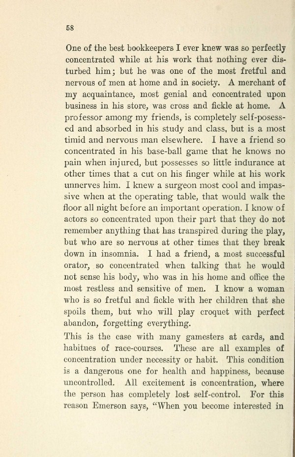 One of the best bookkeepers I ever knew was so perfectly concentrated while at his work that nothing ever disturbed him; but he was one of the most fretful and nervous of men at home and in society. A merchant of my acquaintance, most genial and concentrated upon business in his store, was cross and fickle at home. A professor among my friends, is completely self-possessed and absorbed in his study and class, but is a most timid and nervous man elsewhere. I have a friend so concentrated in his base-ball game that he knows no pain when injured, but possesses so little endurance at other times that a cut on his finger while at his work unnerves him. I knew a surgeon most cool and impassive when at the operating --- table, that would walk the floor all night before an important operation. I know of actors so concentrated upon their part that they do not remember anything that has transpired during the play, but who are so nervous at other times that they break down in insomnia. I had a friend, a most successful orator, so concentrated when talking that he would not sense his body, who was in his home and office the most restless and sensitive of men. I know a woman who is so fretful and fickle with her children that she spoils them, but who will play croquet with perfect abandon, forgetting everything.