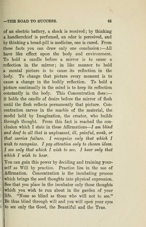 of an electric battery, a shock is received; by thinking a handkerchief is perfumed, an odor is perceived, and by thinking a bread-pill is medicine, one is cured. From these facts you can draw only one conclusion: --- All have like effect upon the body and environment. To hold a candle before a mirror is to cause a reflection in the mirror; in like manner to hold a mental picture is to cause its reflection in the body. To change that picture every moment is to cause a change in the bodily reflection. To hold a picture continually in the mind is to keep its reflection constantly in the body. This Concentration does: it holds the candle of desire before the mirror of flesh until the flesh reflects permanently that picture. Concentration carves in the marble of the material, the model held by Imagination, the creator, who builds through thought. From this fact is reached the conclusion which I state in these Affirmations --- I am blind and deaf to all that is unpleasant, ill, painful, weak, or that carries failure. I recognize only that which I wish to recognize. I pay attention only to chosen ideas. I see only that which I wish to see. I hear only that which I wish to hear.
