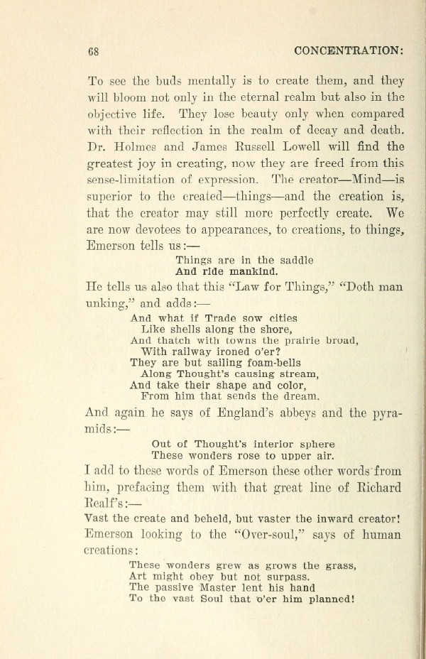 To see the buds mentally is to create them, and they will bloom not only in the eternal realm but also in the objective life. They lose beauty only when compared with their reflection in the realm of decay and death. Dr. Holmes and James Russell Lowell will find the greatest joy in creating, now they are freed from this sense-limitation of expression. The creator-Mind-is superior to the created-things-and the creation is, that the creator may still more perfectly create. We are now devotees to appearances, to creations, to things,
