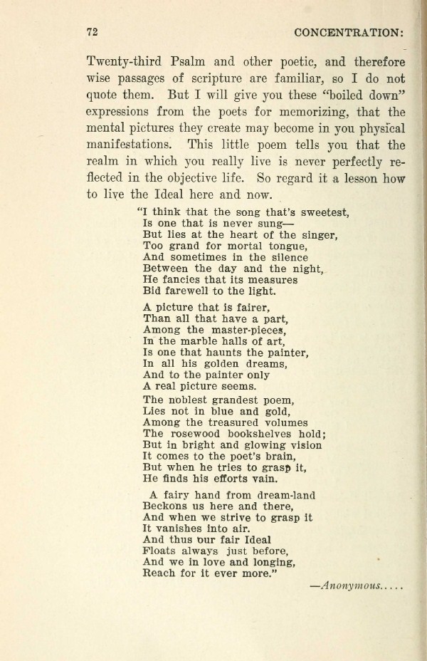 Twenty-third Psalm and other poetic, and therefore wise passages of scripture are familiar, so I do not quote them. But I will give you these "boiled down" expressions from the poets for memorizing, that the mental pictures they create may become in you physical manifestations. This little poem tells you that the realm in which you really live is never perfectly reflected in the objective life. So regard it a lesson how to live the Ideal here and now.
