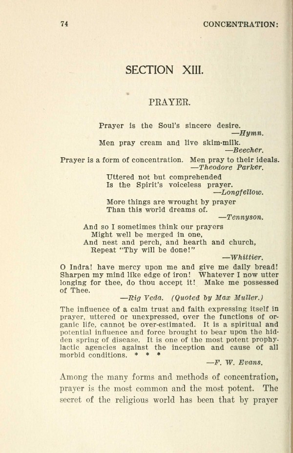 Among the many forms and methods of concentration, prayer is the most common and the most potent. The secret of the religious world has been that by prayer