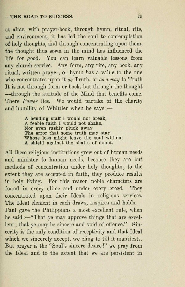at altar, with prayer-book, through hymn, ritual, rite, and environment, it has led the soul to contemplation of holy thoughts, and through concentrating upon them, the thought thus sown in the mind has influenced the life for good. You can learn valuable lessons from any church service. Any form, any rite, any book, any ritual, written prayer, or hymn has a value to the one who concentrates upon it as Truth, or as a way to Truth It is not through form or book, but through the thought -- -through the attitude of the Mind that benefits come. There Power lies. We would partake of the charity and humility of Whittier when he says: