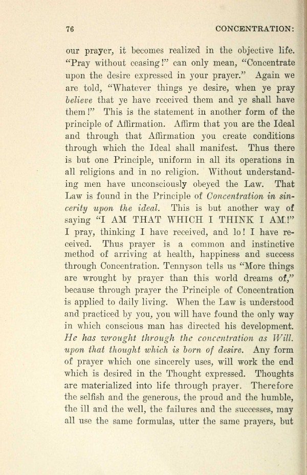 I pray, thinking I have received, and lo! I have received. Thus prayer is a common and instinctive method of arriving at health, happiness and success through Concentration. Tennyson tells us More things are wrought by prayer than this world dreams of, because through prayer the Principle of Concentration is applied to daily living. When the Law is understood and practiced by you, you will have found the only way in which conscious man has directed his development. He has wrought through the concentration as Will. upon that thought which is born of desire. Any form of prayer which one sincerely uses, will work the end which is desired in the Thought expressed. Thoughts are materialized into life through prayer. Therefore the selfish and the generous, the proud and the humble, the ill and the well, the failures and the successes, may all use the same formulas, utter the same prayers, but