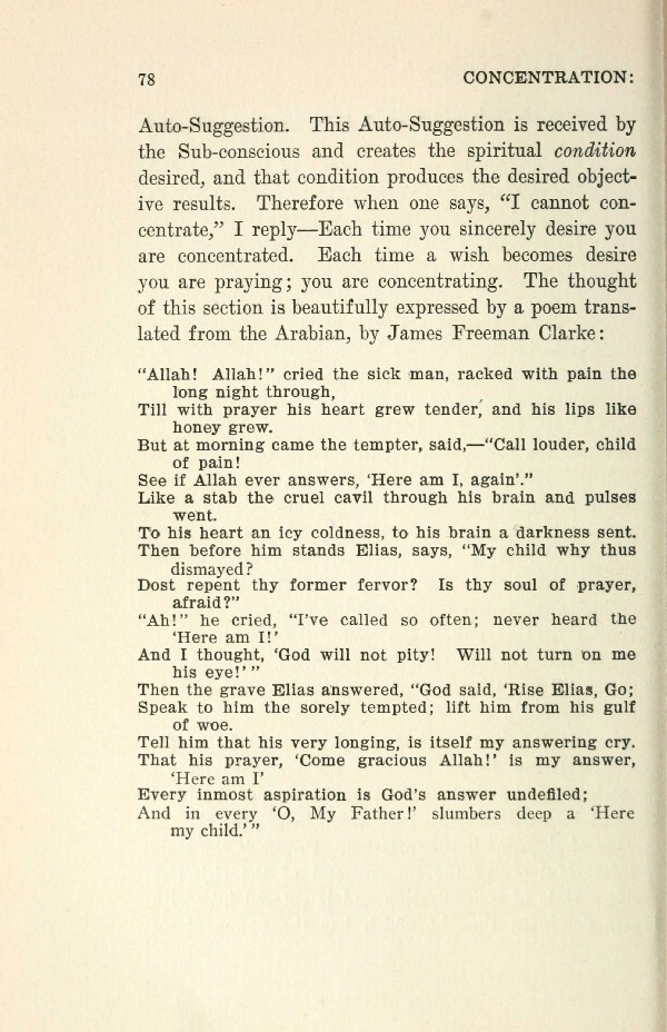 Auto-Suggestion. This Auto-Suggestion is received by the Sub-conscious and creates the spiritual condition desired, and that condition produces the desired objective results. Therefore when one says, "I cannot concentrate," I reply-Each time you sincerely desire you are concentrated. Each time a wish becomes desire you are praying; you are concentrating. The thought of this section is beautifully expressed by a poem translated from the Arabian, by James Freeman Clarke: