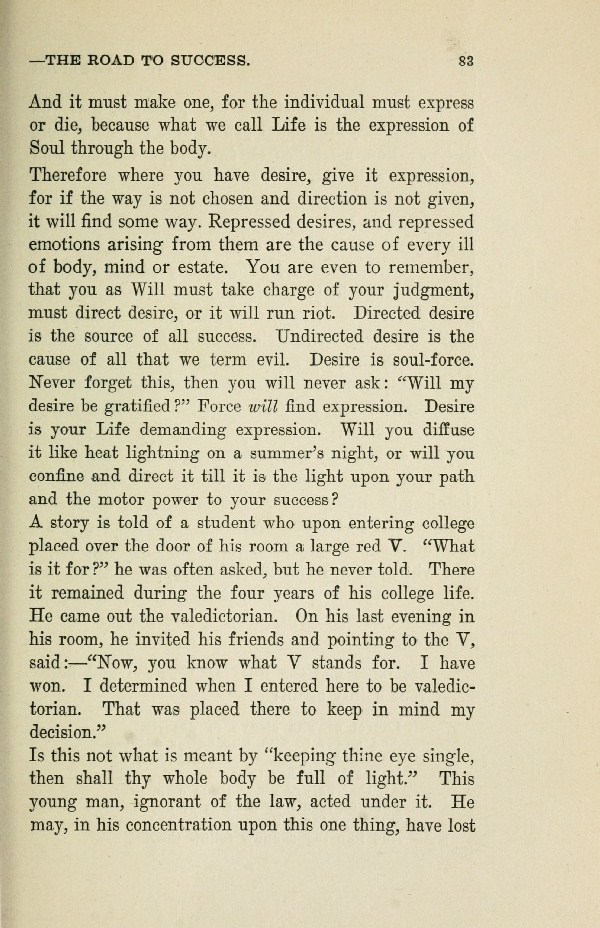 Therefore where you have desire, give it expression, for if the way is not chosen and direction is not given, it will find some way. Repressed desires, and repressed emotions arising from them are the cause of every ill of body, mind or estate. You are even to remember, that you as Will must take charge of your judgment, must direct desire, or it will run riot. Directed desire is the source of all success. Undirected desire is the cause of all that we term evil. Desire is soul-force. Never forget this, then you will never ask:"Will my desire be gratified" Force will find expression. Desire is your Life demanding expression. Will you diffuse it like heat lightning on a summer's night, or will you confine and direct it till it is the light upon your path and the motor power to your success?