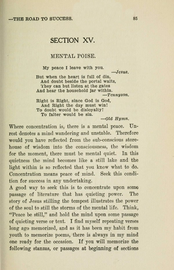 A good way to seek this is to concentrate upon some passage of literature that has quieting power. The story of Jesus stilling the tempest illustrates the power of the soul to still the storms of the mental life. Think, "Peace be still," and hold the mind upon some passage of quieting verse or text. I find myself repeating verses long ago memorized, and as it has been my habit from youth to memorize poems, there is always in my mind one ready for the occasion. If you will memorize the following stanzas, or passages at beginning of sections