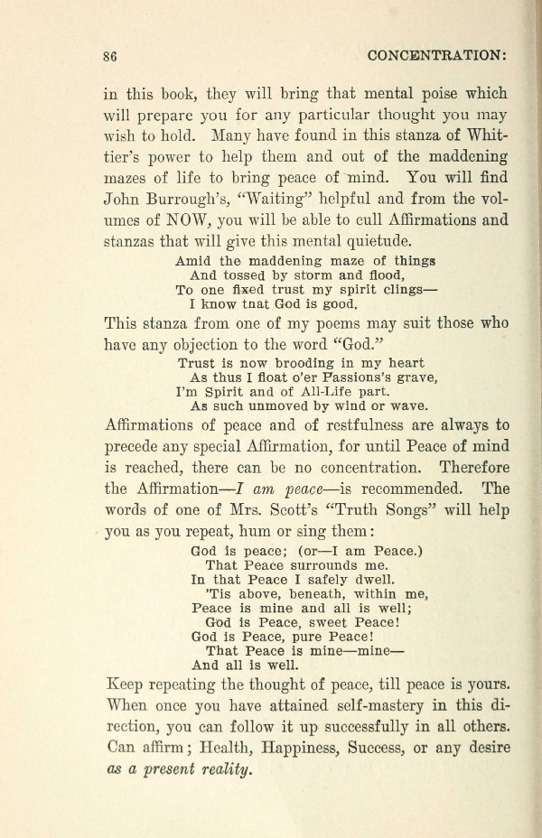in this book, they will bring that mental poise which will prepare you for any particular thought you may wish to hold. Many have found in this stanza of Whittier's power to help them and out of the maddening mazes of life to bring peace of mind. You will find John Burrough's, "Waiting" helpful and from the volumes of NOW, you will be able to cull Affirmations and stanzas that will give this mental quietude.