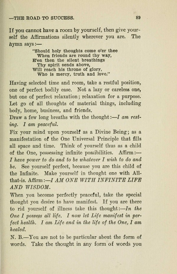 Having selected time and room, take a restful position, one of perfect bodily ease. Not a lazy or careless one, but one of perfect relaxation; relaxation for a purpose. Let go of all thoughts of material things, including body, home, business, and friends.