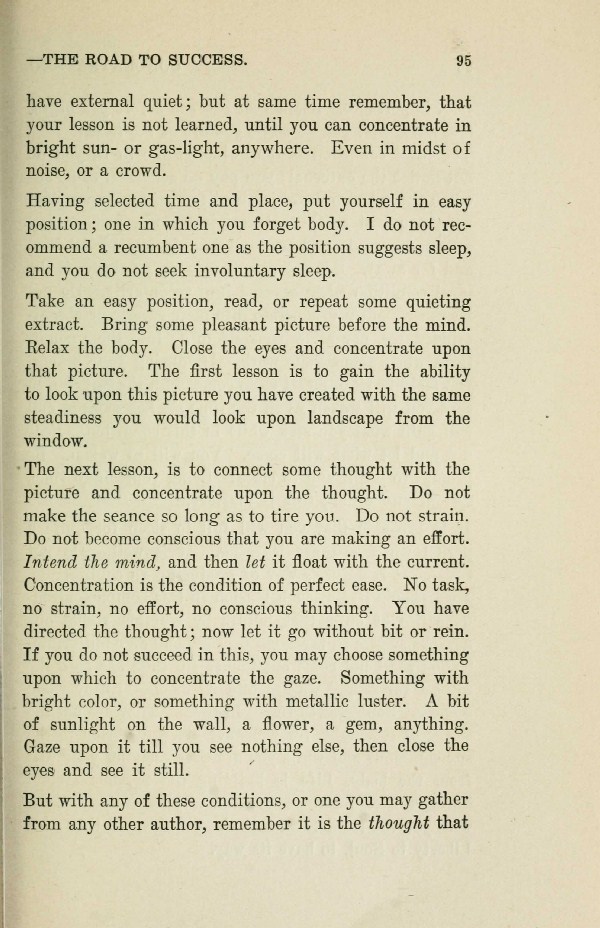 have external quiet; but at same time remember, that your lesson is not learned, until you can concentrate in bright sun- or gas-light, anywhere. Even in midst of noise, or a crowd.