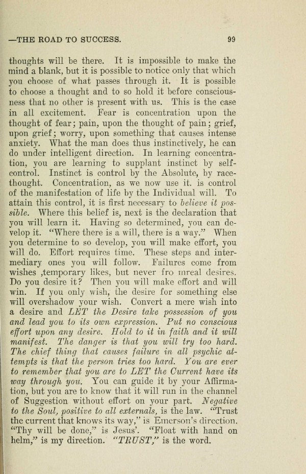 thoughts will be there. It is impossible to make the mind a blank, but it is possible to notice only that which you choose of what passes through it. It is possible to choose a thought and to so hold it before consciousness that no other is present with us. This is the case in all excitement. Fear is concentration upon the thought of fear; pain, upon the thought of pain; grief, upon grief; worry, upon something that causes intense anxiety. What the man does thus instinctively, he can do under intelligent direction. In learning concentration, you are learning to supplant instinct by self- control. Instinct is control by the Absolute, by race- thought. Concentration, as we now use it. is control of the manifestation of life by the Individual will. To attain this control, it is first necessary to believe it possible. Where this belief is, next is the declaration that you will learn it. Having so determined, you can develop it. "Where there is a will, there is a way." When you determine to so develop, you will make effort, you will do. Effort requires time. These steps and intermediary ones you will follow. Failures come from wishes, temporary likes, but never from real desires.