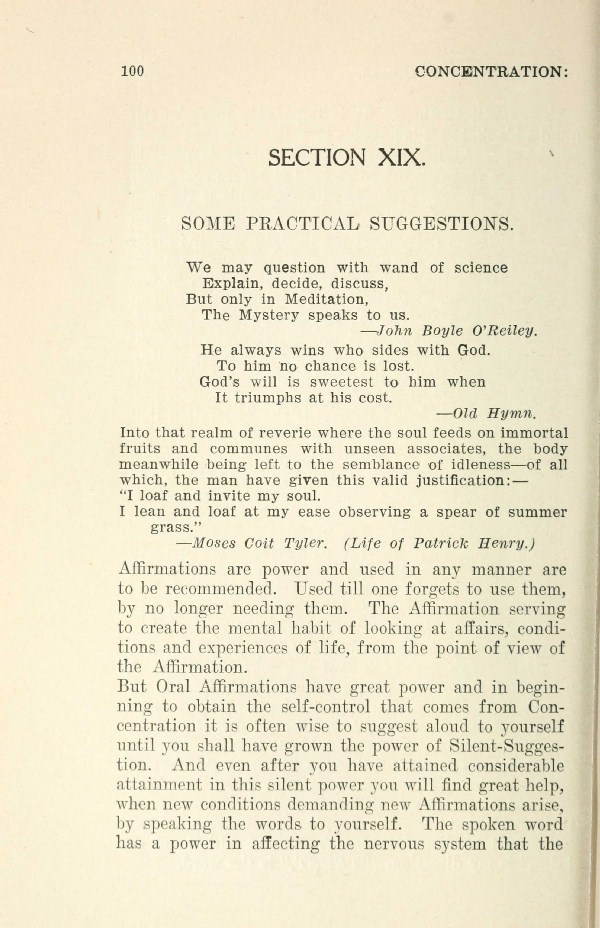 But Oral Affirmations have great power and in beginning to obtain the self-control that comes from Concentration it is often wise to suggest aloud to yourself until you shall have grown the power of Silent-Suggestion. And even after you have attained considerable attainment in this silent power you will find great help, when new conditions demanding new Affirmations arise, by speaking the words to yourself. The spoken word has a power in affecting the nervous system that the