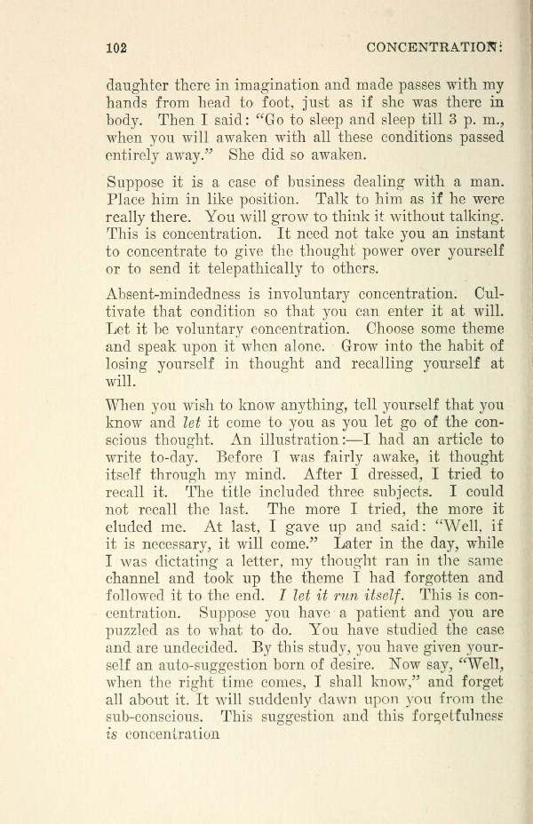 When you wish to know anything, tell yourself that you know and let it come to you as you let go of the conscious thought. An illustration:-I had an article to write to-day. Before I was fairly awake, it thought itself through my mind. After I dressed, I tried to recall it. The title included three subjects. I could not recall the last. The more I tried, the more it eluded me. At last, I gave up and said: "Well, if it is necessary, it will come." Later in the day, while I was dictating a letter, my thought ran in the same channel and took up the theme I had forgotten and followed it to the end. I let it run, itself. This is concentration. Suppose you have a patient and you are puzzled as to what to do. You have studied the case and are undecided. By this study, you have given yourself an auto-suggestion born of desire. Now say,"Well, when the right time comes, I shall know," and forget all about it. It will suddenly dawn upon you from the sub-conscious. This suggestion and this forgetfulness is concentration