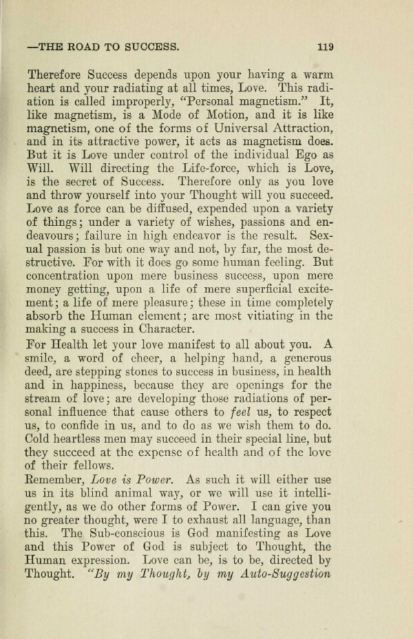 Therefore Success depends upon your having a warm heart and your radiating at all times, Love. This radiation is called improperly, "Personal magnetism." It, like magnetism, is a Mode of Motion, and it is like magnetism, one of the forms of Universal Attraction, and in its attractive power, it acts as magnetism does. But it is Love under control of the individual Ego as Will. Will directing the Life-force, which is Love, is the secret of Success. Therefore only as you love and throw yourself into your Thought will you succeed. Love as force can be diffused, expended upon a variety of things; under a variety of wishes, passions and endeavors; failure in high endeavor is the result. Sexual passion is but one way and not, by far, the most destructive. For with it does go some human feeling. But concentration upon mere business success, upon mere money getting, upon a life of mere superficial excitement; a life of mere pleasure; these in time completely absorb the Human element; are most vitiating in the making a success in Character.
