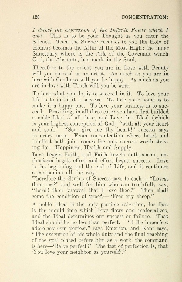 To love what you do, is to succeed in it. To love your life is to make it a success. To love your home is to make it a happy one. To love your business is to succeed. Providing, in all these cases you have first built a noble Ideal of all these, and Love that Ideal (which is your highest conception of God) with all your heart and soul."Son, give me thy heart!" success says to every man. From concentration where heart and intellect both join, comes the only success worth striving for-Happiness, Health and Supply.