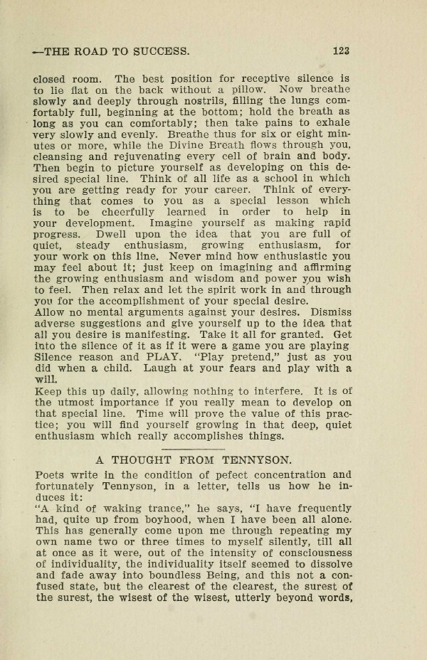 room. The best position for receptive silence is to lie flat on the back without a pillow. Now breathe slowly and deeply through nostrils, filling the lungs comfortably full, beginning at the bottom; hold the breath as long as you can comfortably; then take pains to exhale very slowly and evenly. Breathe thus for six or eight minutes or more, while the Divine Breath flows through you, cleansing and rejuvenating every cell of brain and body. Then begin to picture yourself as developing on this desired special line. Think of all life as a school in which you are getting ready for your career. Think of everything that comes to you as a special lesson which is to be cheerfully learned in order to help in your development. Imagine yourself as making rapid progress. Dwell upon the idea that you are full of quiet, steady enthusiasm, growing enthusiasm, for your work on this line. Never mind how enthusiastic you may feel about it; just keep on imagining and affirming the growing enthusiasm and wisdom and power you wish to feel. Then relax and let the spirit work in and through you for the accomplishment 'of your special desire.
