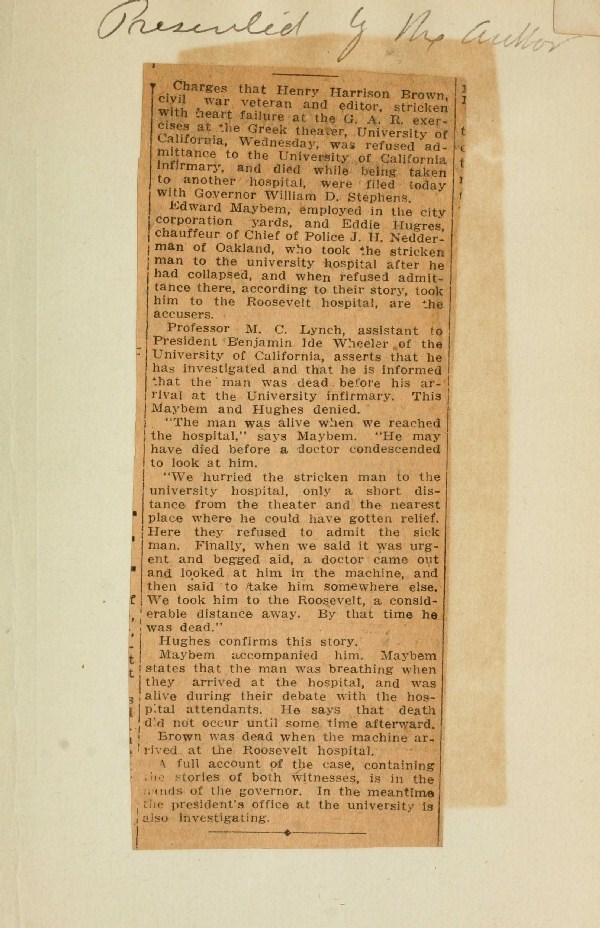 Professor M. C. Lynch, assistant to President Benjamin Ide Wheeler...of the University of California, asserts that he has investigated and that he is informed that the man was dead before his arrival at the University infirmary. This Maybem and Hughes denied.