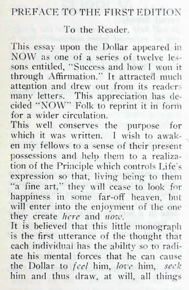 It is believed that this little monograph is the first utterance of the thought that each individual has the ability so to radiate his mental forces that he can cause the Dollar to feel him, love him, seek him and thus draw, at will, all things (page 11) needed for his enfoldment from the Universal Supply.