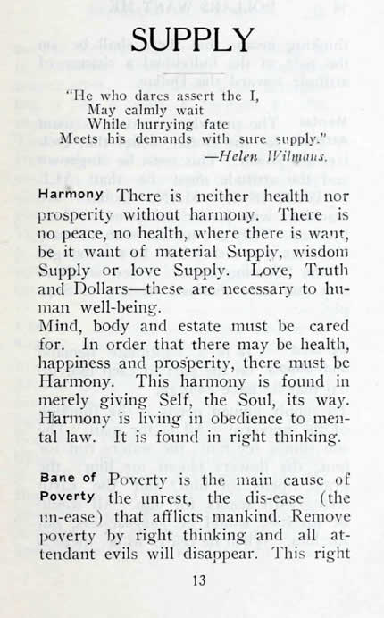 Mind, body and estate must be cared for. In order that there may be health, happiness and prosperity, there must be Harmony. This harmony is found in merely giving Self, the Soul, its way. Harmony is living in obedience to mental law. It is found in right thinking. Bane of Poverty is the main cause of Poverty the unrest, the dis-ease (the un-ease) that afflicts mankind. Remove poverty by right thinking and all attendant evils will disappear. This right