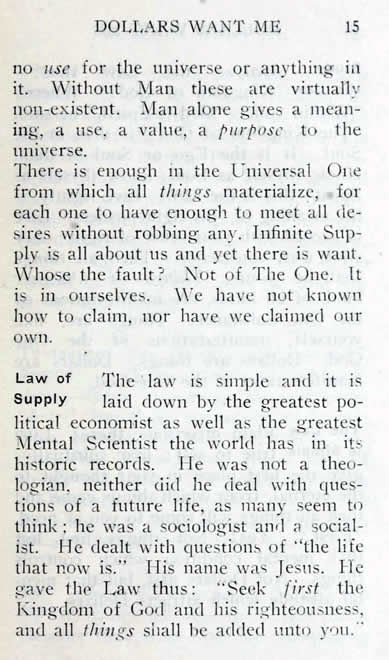 The 'law is simple and it is laid down by the greatest political economist as well as the greatest Mental Scientist the world has in its historic records. He was not a theologian, neither did he deal with questions of a future life, as many seem to think; he was a sociologist and a socialist. He dealt with questions of "the life that now is." His name was Jesus. He gave the Law thus: "Seek first the Kingdom of God and his righteousness, and all things shall he added unto you."