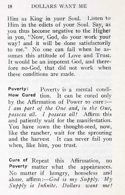 Poverty- is a mental condition. It can be cured only by the Affirmation of Power to cure:I am part of the One and, in the One, possess all. I possess all! Affirm this and patiently wait for the manifestation. You have sown the thought-seed, now, like the rancher, wait for the sprouting and the harvest. It can never fail you when, like him, you trust.