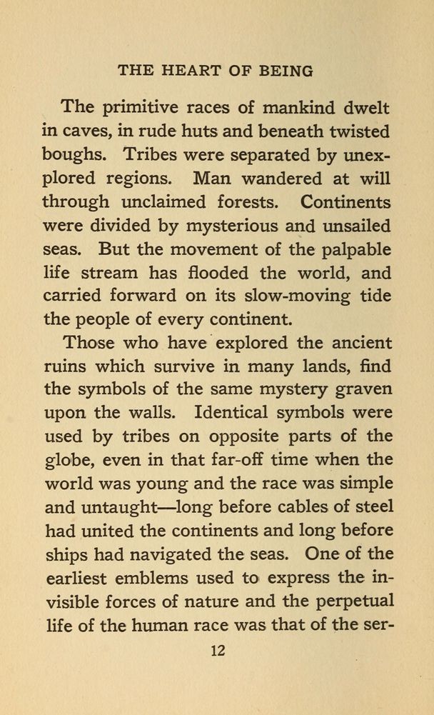 Those who have' explored the ancient ruins which survive in many lands, find the symbols of the same mystery graven upon the walls. Identical symbols were used by tribes on opposite parts of the globe, even in that far-off time when the world was young and the race was simple and untaught --- long before cables of steel had united the continents and long before ships had navigated the seas. One of the earliest emblems used to express the invisible forces of nature and the perpetual life of the human race was that of the serpent.