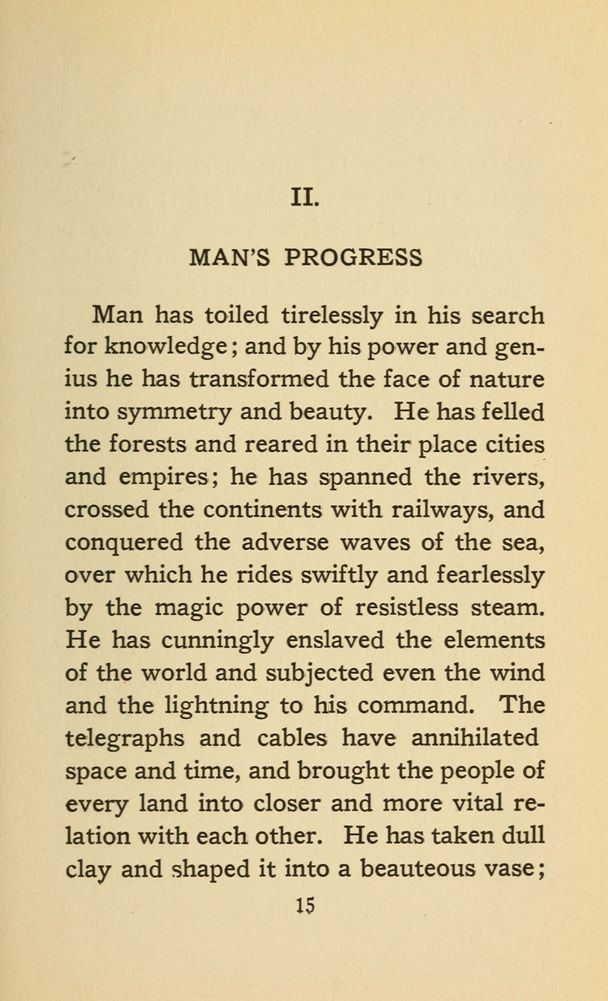 Man has toiled tirelessly in his search for knowledge; and by his power and genius he has transformed the face of nature into symmetry and beauty. He has felled the forests and reared in their place cities and empires; he has spanned the rivers, crossed the continents with railways, and conquered the adverse waves of the sea, over which he rides swiftly and fearlessly by the magic power of resistless steam.