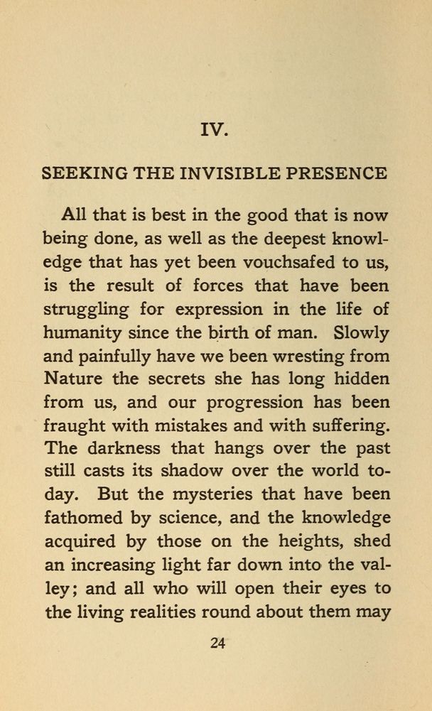 All that is best in the good that is now being done, as well as the deepest knowledge that has yet been vouchsafed to us, is the result of forces that have been struggling for expression in the life of humanity since the birth of man. Slowly and painfully have we been wresting from Nature the secrets she has long hidden from us, and our progression has been fraught with mistakes and with suffering. The darkness that hangs over the past still casts its shadow over the world today. But the mysteries that have been fathomed by science, and the knowledge acquired by those on the heights, shed an increasing light far down into the valley; and all who will open their eyes to the living realities round about them may