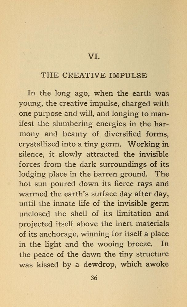 In the long ago, when the earth was young, the creative impulse, charged with one purpose and will, and longing to manifest the slumbering energies in the harmony and beauty of diversified forms, crystallized into a tiny germ. Working in silence, it slowly attracted the invisible forces from the dark surroundings of its lodging place in the barren ground. The hot sun poured down its fierce rays and warmed the earth's surface day after day, until the innate life of the invisible, germ unclosed the shell of its limitation and projected itself above the inert materials of its anchorage, winning for itself a place in the light and the wooing breeze. In the peace of the dawn the tiny structure was kissed by a dewdrop, which awoke