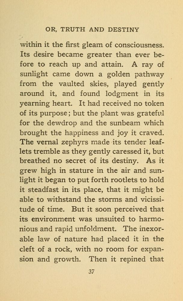 The vernal zephyrs made its tender leaflets tremble as they gently caressed it, but breathed no secret of its destiny. As it grew high in stature in the air and sunlight it began to put forth rootlets to hold it steadfast in its place, that it might be able to withstand the storms and vicissitude of time. But it soon perceived that its environment was unsuited to harmonious and rapid unfoldment. The inexorable law of nature had placed it in the cleft of a rock, with no room for expansion and growth. Then it repined that